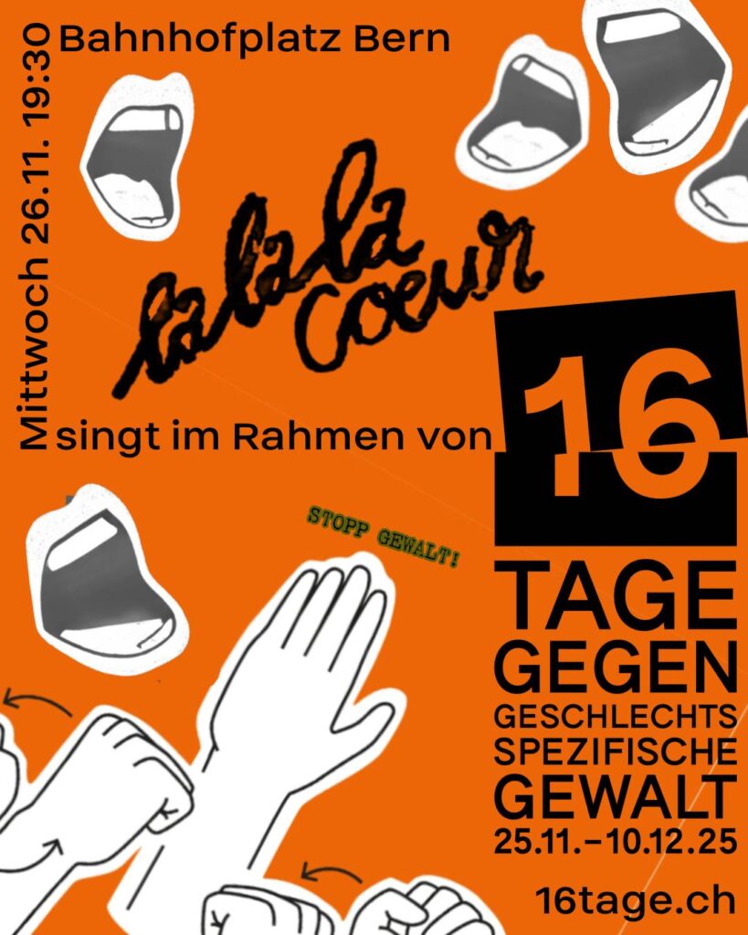 «Lalala Coeur» ist der Chor für alle im Queer-feministischen Raum der Reitschule Bern (ehemals Frauenraum). Der Chor widmet sich in seinen meist jährlich erarbeiteten Programmen vorrangig queeren und feministischen Inhalten, die in einen thematischen Kontext gesetzt werden. Der Zusatz «Chor für alle» ist inkludierend: Alle Menschen sind willkommen die bereit sind unsere Kerninhalte mitzutragen.